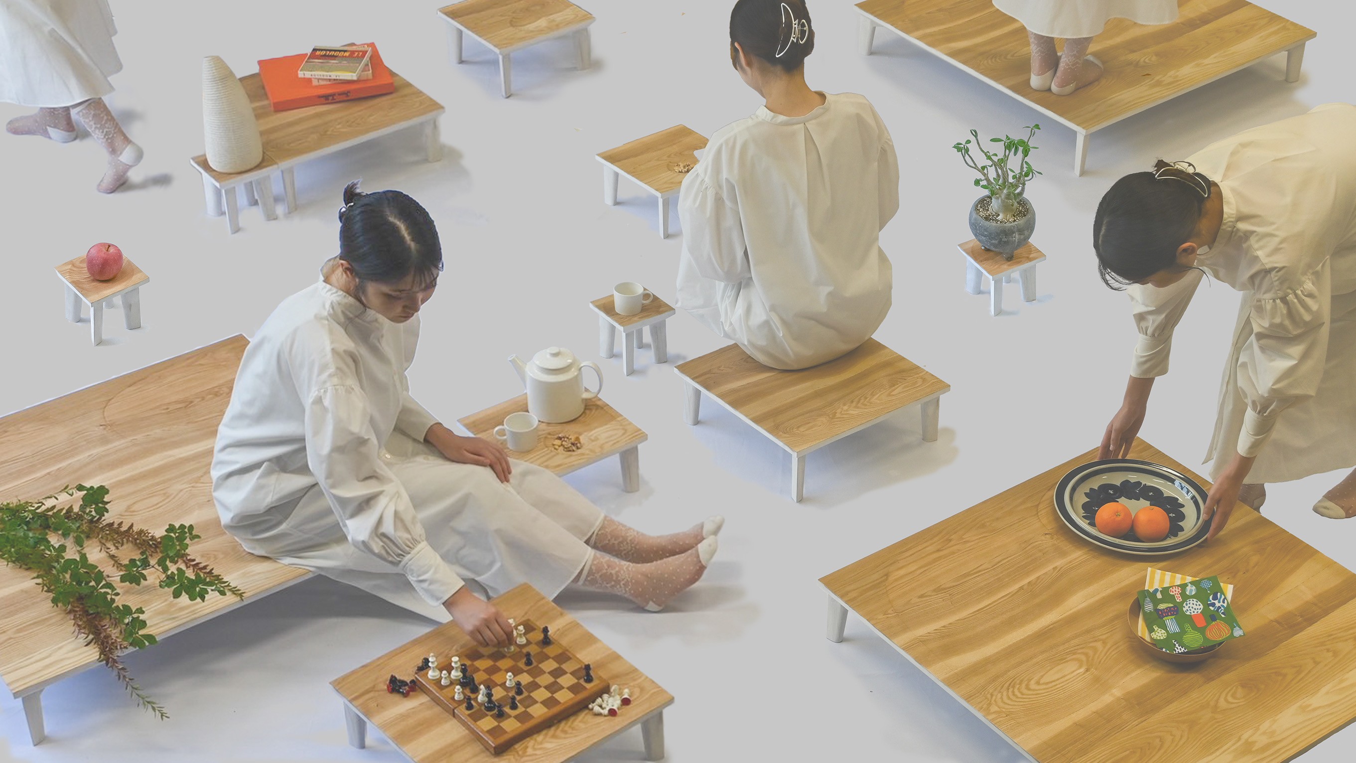 This collection reintroduces the wisdom of ‘floor seating’ into contemporary life. Four types of seating patterns, created by halving a half-tatami size repeatedly, enable users to sit, place objects, or lie down. The gentle undulations on each surface invite postures and gestures with every touch.